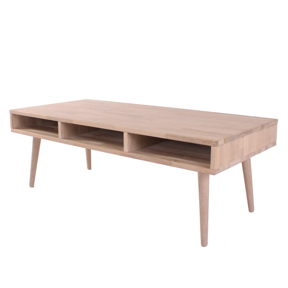 Sofabord i massiv egetræ med smarte hylder Belfort er et aflangt sofabord med smarte opbevaringsrum. Det gør det nemt at gemme aviser, blade, magasiner, fjernbetjeninger m. m. væk. Sofabordet er fremstillet af massiv egetræ og er behandlet med hvidtonet s