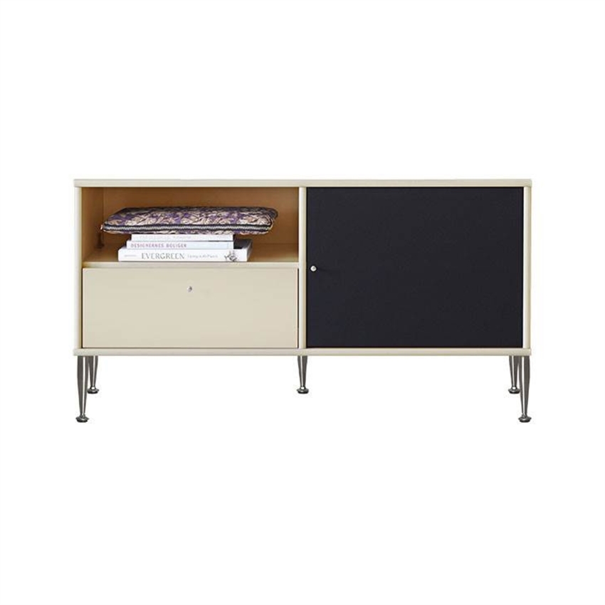 Mistral TV-bordet med skuffe og stofdør er ideelt til stilfuld opbevaring i stuen. Dette væghængte møbel forener elegance med praktisk funktionalitet
