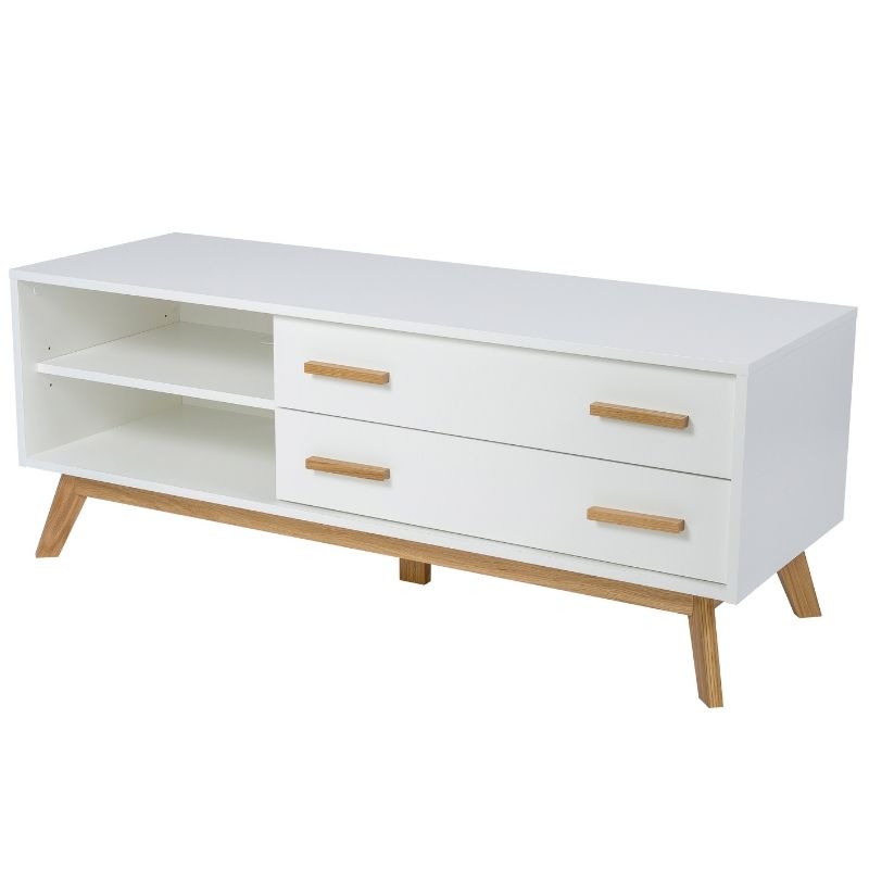 Enkelt hvidt tv-bord i melamin og egetræ Kensal tv-bord på 130 cm x 45 cm x 50 cm fra Woodman. Tv-bordet er udført i hvid melamin med ben og greb i massiv egetræ. I venstre side er der to åbne opbevaringsrum, mens der i højre side er to store skuffer. Hyl