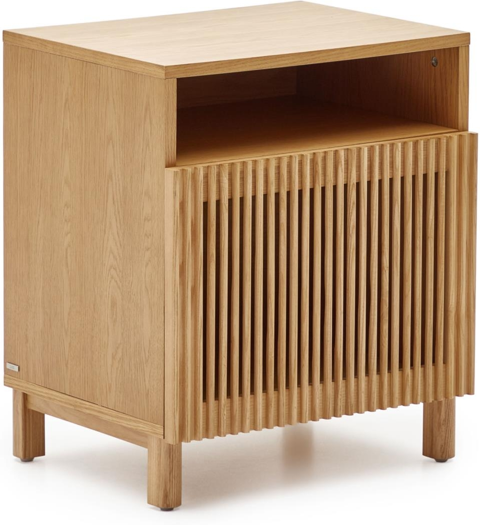 Beyla sengebord fra Kave Home kombinerer nordisk ro med en varm, tidløs æstetik, som passer perfekt ind i både moderne og mere rustikke soveværelser. På billedet kan du se den naturlige, lyse trætone og de karakteristiske lodrette lameller på døren, som l
