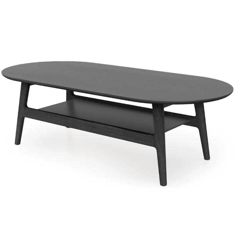 Flot sofabord fra Woodman med hylde Ovalt sofabord på 130 cm x 60 cm x 39 cm i egetræ og egetræsfiner. Sofabordet kan fås i to flotte varianter, alt efter om du ønsker det i den naturlige eg eller i sortmalet egetræ vælg variant ovenfor. På det store ov