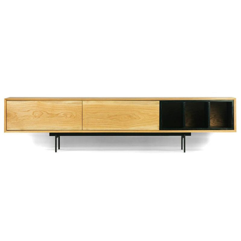 Praktisk TV-bord i eg med flere opbevaringsrum Dette Rosto TV-bord er den perfekte løsning til alle stuer. Det er udført i massiv egetræ og sort metal. Træet er behandlet med olie for at øge holdbarheden. TV-bordet har en masse praktisk opbevaringsplads i