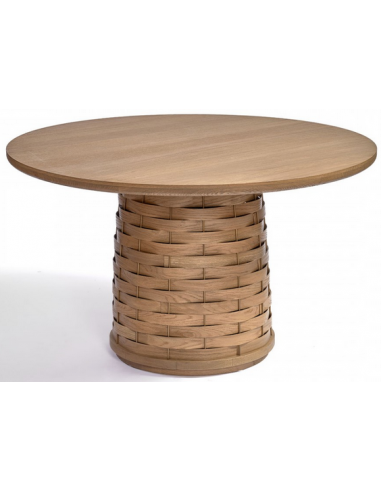 Rundt spisebord udført i et design af egetræ og egetræsfinr. Spisebordet måler 130 cm i diameter og 76 cm i højden. Forventet leveringstid: Tillad op til 6 ugerRundt spisebord udført i et design af egetræ og egetræsfinr. Spisebordet måler 130 cm i