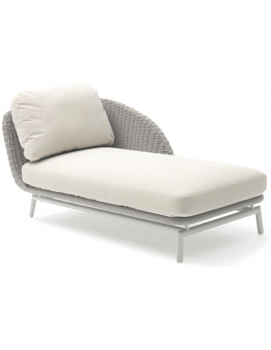 Scoop venstrevendt solseng udført i et moderne design af lysegrålakeret aluminium og greigefarvet vandafvisende Couturetex reb tekstil med hurtigtørrende skumfyld. Solsengen måler 42 – 70 cm i højden med ligge-siddehøjde på 42 cm. Til solsengen medfølger