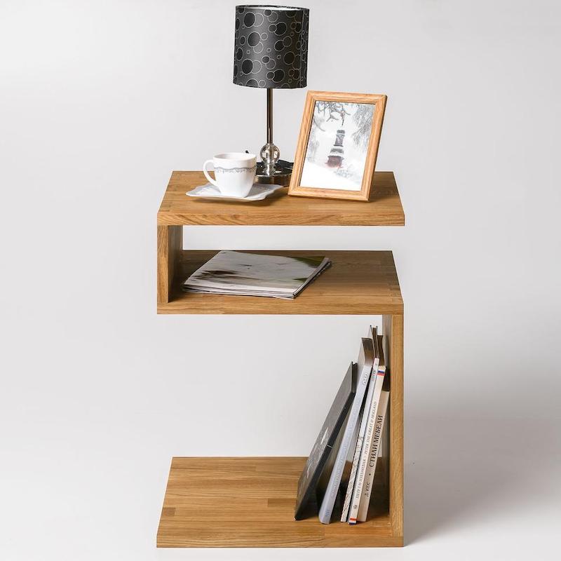 Sengebord i massiv egetræ med smukt og unikt design Dette smarte sengebord i egetræ måler 44 x 44 x 62 cm og er perfekt ved siden af sengen. Med det unikke design får du to hylder, hvor du fint kan have et par bøger og magasiner stående samt have din smar