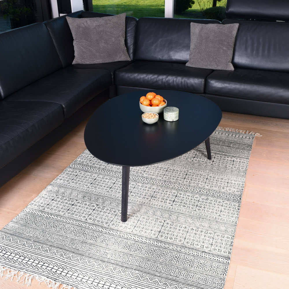Sofabord i flot organisk form. Sort højtrykslaminat med sort kant og sorte massive egeben. Dette sofabord som er både stilrent og tidløst passer perfekt ind i den moderne boligindretning. Det fine Grenoble bord appelerer bredt. Den kan også kombineres