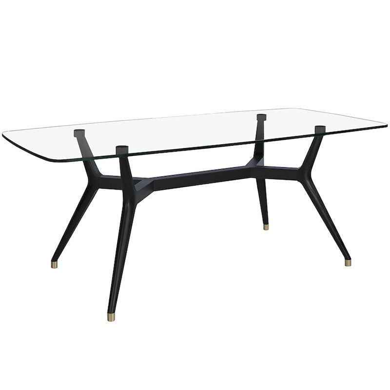 Firkantet spisebord med glasbordplade og sortmalede bordben Spisebord på 200 cm x 95 cm x 75 cm i glas, wenge træ og rustfrit stål. Selve bordpladen er i 10 mm tempereret glas, mens benene er i sortmalet wenge træ. Beslagene mellem glasbordpladen og bordb