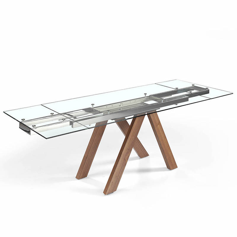 Stort spisebord i glas og valnød der kan forlænges Spisebord med udtræk i tempereret glas, valnøddefiner og stål. Spisebordet måler 160 cm x 90 cm x 76 cm og har en tillægsplade i hver ende, så det kan forlænges til 200 cm med den ene plade og 240 cm med